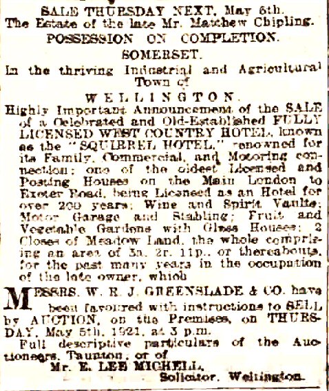 Large numbers of people, besides residents in Wellington and district, will learn with feelings of sorrow that Mr. Matthew Chipling, the much respected and well-known proprietor of the Squirrel Hotel, Wellington, Somerset, has died, at the age of 77 years, and will extend their sincere sympathy to the widow, sons and daughters of the deceased. "Matt," as he was jocularly named, was landlord of the Squirrel for 31 years, and before that he was at the Ship Inn for 19 years, making a total of fifty years as a licensed victualler in the town. Before that, he was connected with the Nynehead Estate, in the days of the late Mr. E. A. Sandford. When a young man, he took a keen interest in hunting and shooting, and he was regarded as an authority on horses, being often seen at the Exeter Repository, purchasing noting but the best animals. In recent years Mr. Chipling had not enjoyed good health, and he was confined to his bed for a good part of this time.